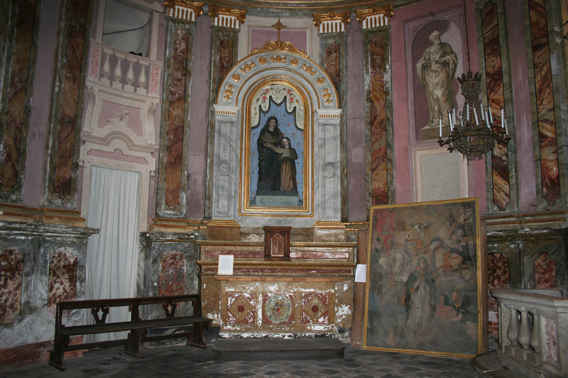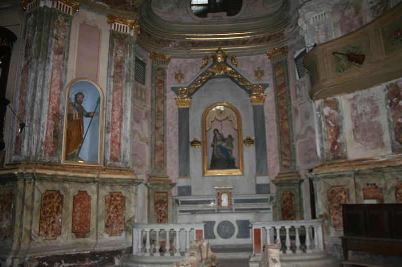 Le decorazioni pittoriche a secco tra cui le raffigurazioni dei Santi Francesco e Grato furono realizzati nella seconda metà XIX sec. e ripresi ai primi del ‘900 dall’équipe Pinotti. Inseriti nelle pareti laterali, al di sopra di due nicchie, i profili in marmo bianco dei Santi Fabiano e Paola, le cui insigni reliquie sono conservate nella chiesa.