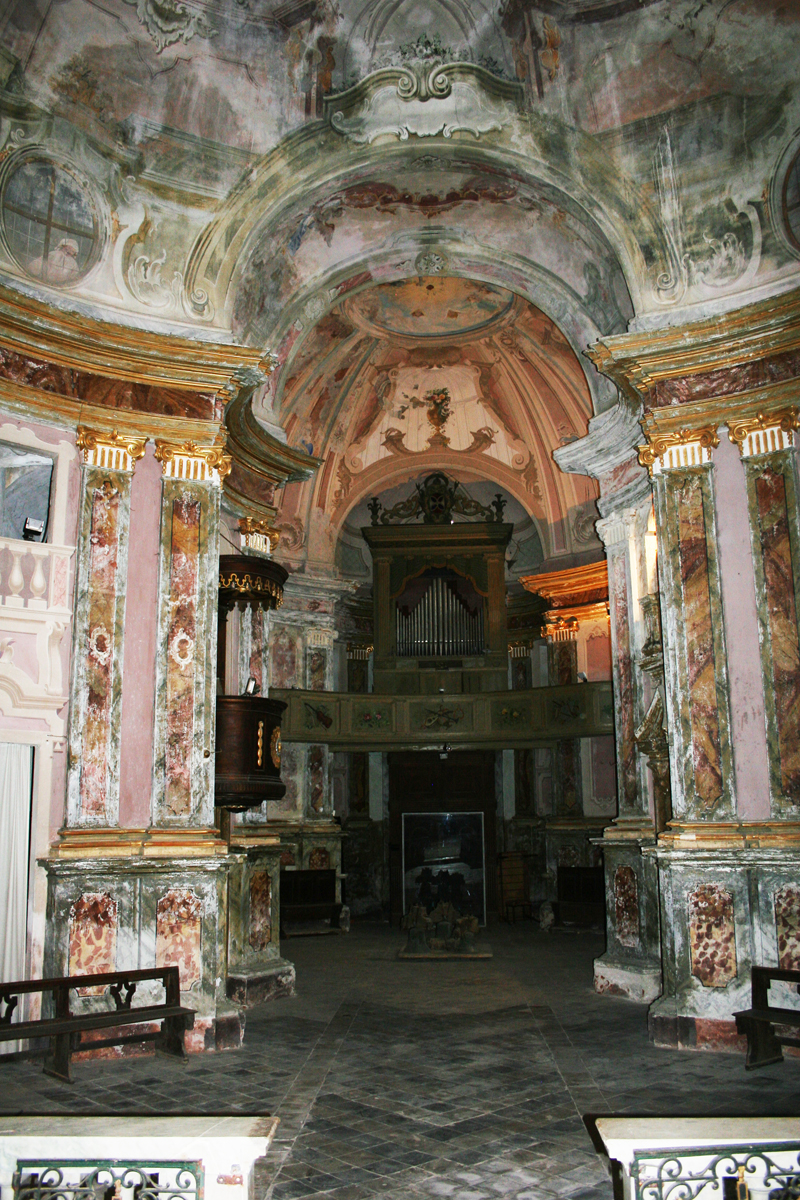 CHIESA DI SAN SEBASTIANOLa Chiesa della Confraternita dei Battuti Bianchi, dedicata a San Sebastiano, si affaccia sull’attuale piazza Dante all’imbocco con via Mazzini (antica via della Piazza). La fondazione della Confraternita, che si occupava di bambini poveri e orfani, assisteva malati e diseredati, è antecedente il 1528, quando documenti ne attestano l’esistenza: l’antica sede del sodalizio sorgeva ‘a levante della parrocchiale’ e fu abbattuta dopo la costruzione dell’attuale edificio. Nella seconda metà del ‘700, dopo un progetto di B.A. Vittone, rifiutato perché troppo grandioso, fu chiesta a Filippo Nicolis di Robilant (1723-1783) la pianta dell’attuale edificio, ch’egli risolse con singolare ingegno e straordinario gusto scenografico, avvezzo com’era all’elaborazione di apparati per i teatri e le feste di Corte. Il cantiere di costruzione si protrasse dal 1765 al 1774 e si avvalse dell’opera dello stuccatore F. Barelli; nel 1776 il pittore Toscanelli ne decorava pareti e soffitti con una sensibilità ed un’eleganza verosimilmente suggerite ancora dal Robilant. Successivi interventi decorativi (fratelli Prinotti, primo ‘900) reinterpretarono e coprirono parte delle antiche pitture che, fortunatamente, riaffiorano per la caduta di frammenti di colore. Il coro, con stucchi di N.Soleri, fu aggiunto tra il 1846-47 su disegno dell’architetto monregalese G.B. Gorresio. L’oratorio di San Sebastiano raccoglieva le famiglie di più antica storia presenti in paese: non a caso anche i Conti Costa della Trinità, Signori di Carrù (una tra le famiglie più in vista presso la Corte Sabauda) era legatissima a questa chiesa e fu Vittorio della Trinità, Viceré di Sardegna e Priore della Confraternita, ad invitare a Carrù l’amico Robilant, pagato dai confratelli con “regali di trifole, salmate di vino bianco, robiole, pescarie e volatili”.