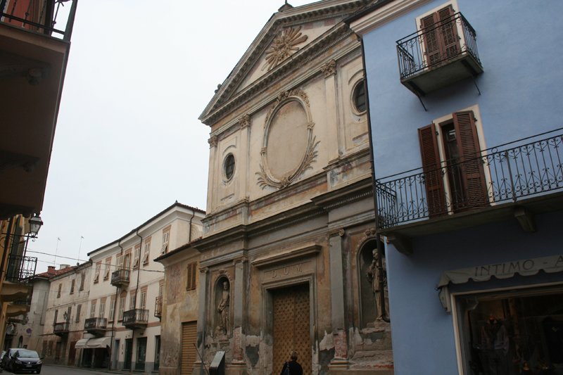 CHIESA DELLA CONFRATERNITA DI SAN GIOVANNI BATTISTA DECOLLATO O DEI ‘BATTUTI NERI’La fondazione della Confraternita, che svolgeva assistenza ai moribondi, ai carcerati ed ai condannati a morte, risale al 1616; il sodalizio occupava sin d’allora la sede attuale che, intorno alla metà del ‘700, fu risistemata su progetto dello scenografo – quadraturista Nicolao Dallamano, figlio di Giuseppe. L’interno è giocato da una decorazione a trompe l’oeil, fastosa ed esuberante, scaturita dal genio creativo del Dallamano, contemporaneamente attivo in un altro cantiere carrucese, la dimora degli Alessi di Canosio sulla Piazza. Per le figure lo affianca, in entrambi i casi, un pittore non ben identificato, assai affine ai modi di M.A.Milocco: ‘il Battista in gloria tra angeli’ al centro del soffitto crea illusione di sfondamento ed offre uno scorcio di Paradiso. Il coro fu aggiunto, per rinnovate esigenze di culto, nel corso del XIX° sec. con interventi dei pittori F.Toscano e C.Vicino, così come la facciata esterna è ottocentesca, con statue del Battista e di S.Giovanni Nepomuceno dello scultore A.Roasio. Alla Confraternita erano legati i Conti Alessi di Canosio, proprietari del ‘Filatoio da seta’ nella valle del Rivo: di loro patronato l’altare del Crocifisso (a sinistra entrando) ai cui piedi avevano diritto di sepoltura; di fronte l’altare dedicato a S. Giovanni Nepomuceno. Nella chiesa è conservata la statua settecentesca della ‘Madonna del Carmine’, cui i carrucesi erano particolarmente devoti. Nel piccolo edificio posto accanto alla chiesa (a sinistra guardando la facciata, caratterizzato dall’affresco della SS.Trinità) era ospitato l’antico ospedale del paese che nei primi anni del ‘700 fu spostato nella sede odierna; l’edificio divenne allora sede del Comune e del carcere. Capolavori del XVIII° sec. custoditi all’interno dell’edificio: la ‘decorazione scenografica’ di Nicolao Dallamano nella sua globalità; le statue policrome processionali del ‘Cristo portacroce’ e dell’Angelo recante la testa del Battista’ riferibili a G.B. Bernero nella prima fase della sua attività. Nel basso edificio, facente parte del complesso ecclesiastico, è inserito un affresco seicentesco che raffigura la SS.Trinità, che presenta una spiccata cromia: è una rara immagine della Trinità in cui compare la colomba dello Spirito Santo, Dio Padre ed il Crocifisso all’interno di una esuberante cornice a volute vegetali. Va ribadito che nel Seicento la costruzione ospitava il primo nucleo dell’Ospedale di Carrù; poi, nel Settecento e primo Ottocento divenne sede del Comune e delle Carceri.