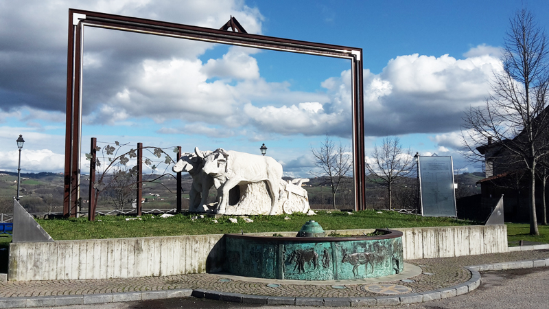 L’opera costruita da sei scene a bassorilievo in bronzo strettamente collegate alla “storia contadina e alla figura del bue” dalla nascita del vitellino, all’allevamento, alla macellazione, alla tavola e da un’ulteriore scultura in marmo raffigurante due buoi aggiogati realizzata dal maestro Raffaele Mondazzi. Il progetto dell’opera è stato realizzato e seguito dall’Arch: Danilo Tomatis.