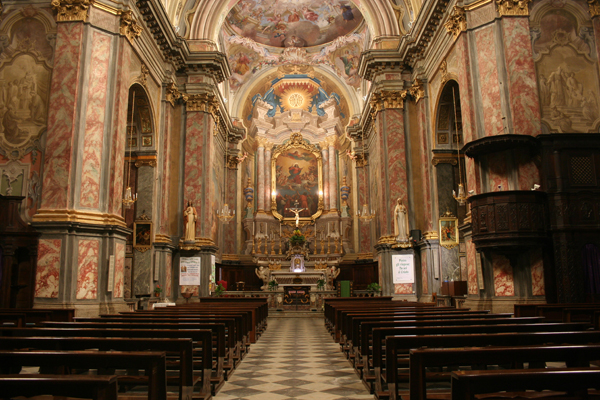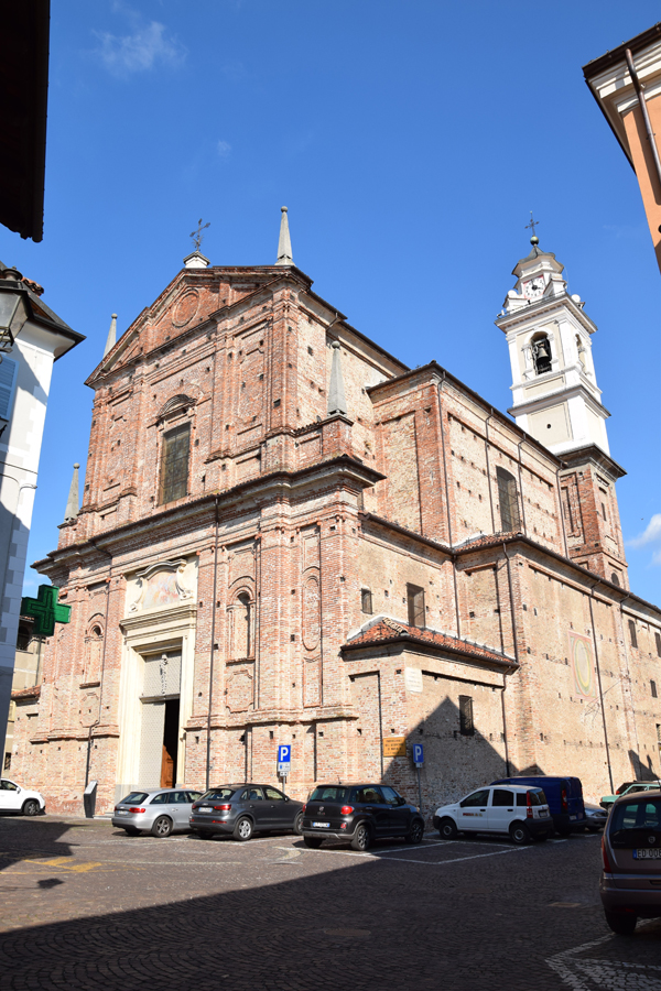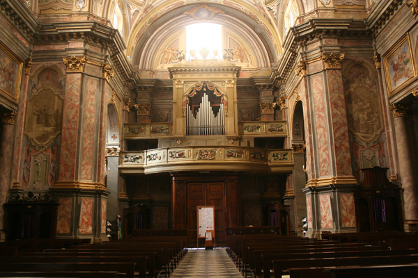 INTERNO Per la sistemazione e decorazione interna della chiesa si succedono numerose maestranze, marmorari, stuccatori, falegnami, pittori, scultori, fabbri e vetrai, che lavorano per apparati e arredi, in un itinerario complesso di interventi, che va oltre il cantiere di Francesco Gallo. I primi significativi lavori d’arredo nel maestoso spazio interno interessano le due grandi cappelle laterali: entrando a destra l’altare delle Anime e a sinistra l’altare della Madonna del Rosario, autografi del Gallo, furono realizzati dal marmoraro genovese Torre (1717-18). I lavori delle due preziose cappelle sono pagati dalle compagnie omonime e con denari che provengono dal Priore Luca Antonio Zavatteri (Rosario) e dalla Dama Camilla Piacenza di Farigliano (Anime). Tra il 1725 e il 1730 è chiamata l’équipe dello stuccatore luganese Cipriano Beltramelli, attivo in Piemonte, che con gusto raffinato inserisce i capitelli corinzi sulle lesene e sulle colonne e modella il cornicione (che corre in alto lungo il perimetro della chiesa) e le cartelle in stucco, che coronano gli arconi laterali.