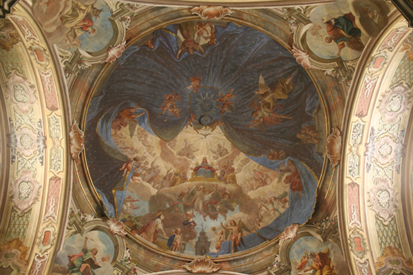 Nella metà del secolo, L. Hartman, P.E. Morgari e Molineris dipinsero l’Empireo nella grande cupola centrale con un manto stellato in parte sollevato su una visione paradisiaca, dove tra un turbinio di angeli e putti la Vergine accoglie gli omaggi di Carrù, che offre prodotti della terra in sembianze femminili. Successivamente, Fava, nel 1900 dipinse i quattro Evangelisti nei peducci che la sostengono.