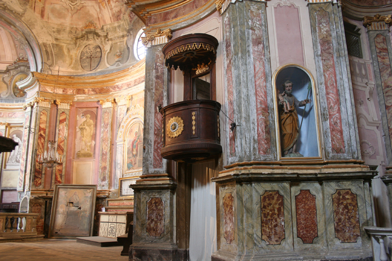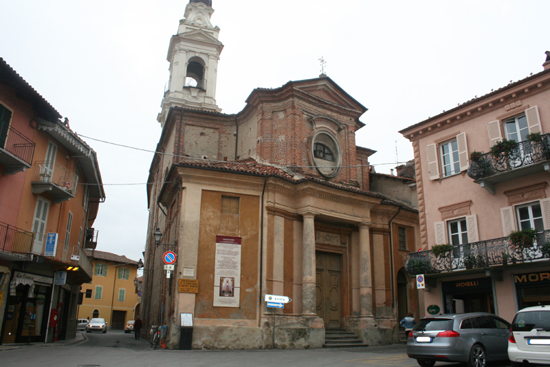 CHIESA DI SAN SEBASTIANOLa Chiesa della Confraternita dei Battuti Bianchi, dedicata a San Sebastiano, si affaccia sull’attuale piazza Dante all’imbocco con via Mazzini (antica via della Piazza). La fondazione della Confraternita, che si occupava di bambini poveri e orfani, assisteva malati e diseredati, è antecedente il 1528, quando documenti ne attestano l’esistenza: l’antica sede del sodalizio sorgeva ‘a levante della parrocchiale’ e fu abbattuta dopo la costruzione dell’attuale edificio. Nella seconda metà del ‘700, dopo un progetto di B.A. Vittone, rifiutato perché troppo grandioso, fu chiesta a Filippo Nicolis di Robilant (1723-1783) la pianta dell’attuale edificio, ch’egli risolse con singolare ingegno e straordinario gusto scenografico, avvezzo com’era all’elaborazione di apparati per i teatri e le feste di Corte. Il cantiere di costruzione si protrasse dal 1765 al 1774 e si avvalse dell’opera dello stuccatore F. Barelli; nel 1776 il pittore Toscanelli ne decorava pareti e soffitti con una sensibilità ed un’eleganza verosimilmente suggerite ancora dal Robilant. Successivi interventi decorativi (fratelli Prinotti, primo ‘900) reinterpretarono e coprirono parte delle antiche pitture che, fortunatamente, riaffiorano per la caduta di frammenti di colore. Il coro, con stucchi di N.Soleri, fu aggiunto tra il 1846-47 su disegno dell’architetto monregalese G.B. Gorresio. L’oratorio di San Sebastiano raccoglieva le famiglie di più antica storia presenti in paese: non a caso anche i Conti Costa della Trinità, Signori di Carrù (una tra le famiglie più in vista presso la Corte Sabauda) era legatissima a questa chiesa e fu Vittorio della Trinità, Viceré di Sardegna e Priore della Confraternita, ad invitare a Carrù l’amico Robilant, pagato dai confratelli con “regali di trifole, salmate di vino bianco, robiole, pescarie e volatili”.