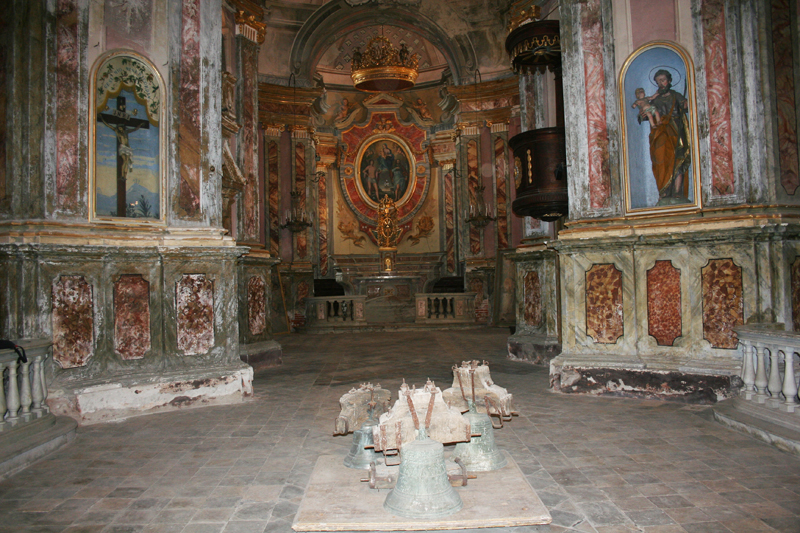 INTERNOLa Chiesa della Confraternita dei Battuti Bianchi è un autentico gioiello d’arte. L’architettura tesa e nervosa disegnata dal conte Filippo Nicolis di Robilant gioca con effetti chiaro-scurali e si avvale di una decisa impostazione scenografica: qui è risolto uno degli spazi più caratterizzati e armonici del concentrico carrucese. L’edificio presenta in pianta una successione ritmica di partizioni, in cui prevale l’elemento della linea curva. Il pavimento della chiesa, realizzato in pietra di Barge, è posto in leggera salita.