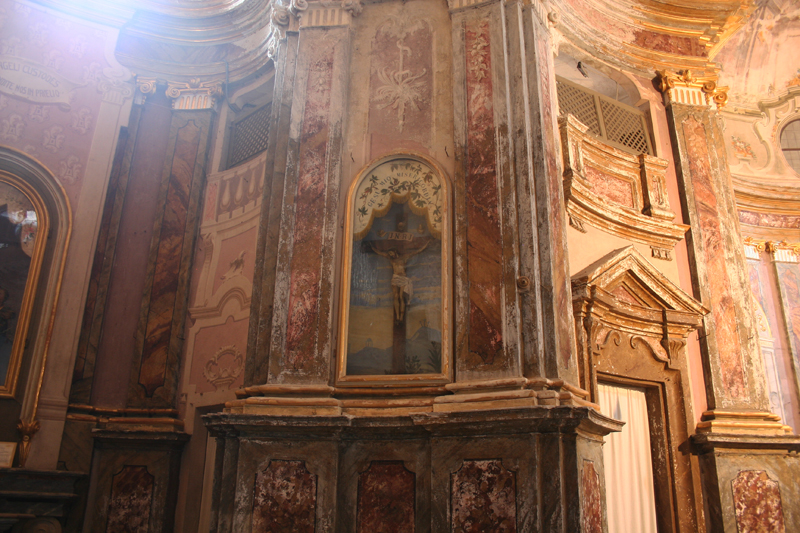 Le decorazioni pittoriche a secco tra cui le raffigurazioni dei Santi Francesco e Grato furono realizzati nella seconda metà XIX sec. e ripresi ai primi del ‘900 dall’équipe Pinotti. Inseriti nelle pareti laterali, al di sopra di due nicchie, i profili in marmo bianco dei Santi Fabiano e Paola, le cui insigni reliquie sono conservate nella chiesa.