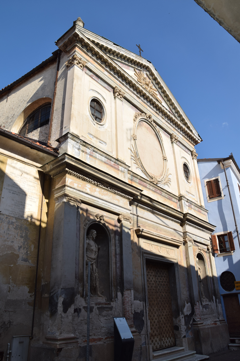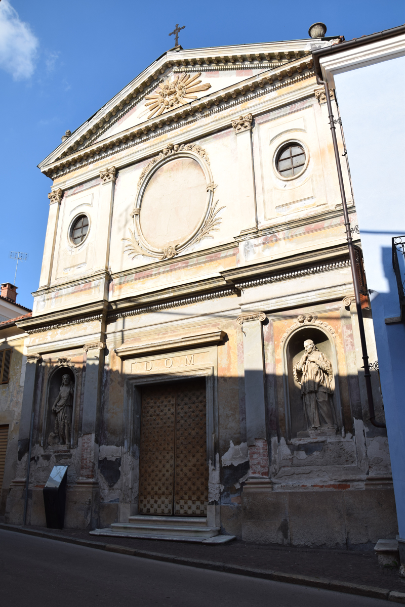CHIESA DELLA CONFRATERNITA DI SAN GIOVANNI BATTISTA DECOLLATO O DEI ‘BATTUTI NERI’La fondazione della Confraternita, che svolgeva assistenza ai moribondi, ai carcerati ed ai condannati a morte, risale al 1616; il sodalizio occupava sin d’allora la sede attuale che, intorno alla metà del ‘700, fu risistemata su progetto dello scenografo – quadraturista Nicolao Dallamano, figlio di Giuseppe. L’interno è giocato da una decorazione a trompe l’oeil, fastosa ed esuberante, scaturita dal genio creativo del Dallamano, contemporaneamente attivo in un altro cantiere carrucese, la dimora degli Alessi di Canosio sulla Piazza. Per le figure lo affianca, in entrambi i casi, un pittore non ben identificato, assai affine ai modi di M.A.Milocco: ‘il Battista in gloria tra angeli’ al centro del soffitto crea illusione di sfondamento ed offre uno scorcio di Paradiso. Il coro fu aggiunto, per rinnovate esigenze di culto, nel corso del XIX° sec. con interventi dei pittori F.Toscano e C.Vicino, così come la facciata esterna è ottocentesca, con statue del Battista e di S.Giovanni Nepomuceno dello scultore A.Roasio. Alla Confraternita erano legati i Conti Alessi di Canosio, proprietari del ‘Filatoio da seta’ nella valle del Rivo: di loro patronato l’altare del Crocifisso (a sinistra entrando) ai cui piedi avevano diritto di sepoltura; di fronte l’altare dedicato a S. Giovanni Nepomuceno. Nella chiesa è conservata la statua settecentesca della ‘Madonna del Carmine’, cui i carrucesi erano particolarmente devoti. Nel piccolo edificio posto accanto alla chiesa (a sinistra guardando la facciata, caratterizzato dall’affresco della SS.Trinità) era ospitato l’antico ospedale del paese che nei primi anni del ‘700 fu spostato nella sede odierna; l’edificio divenne allora sede del Comune e del carcere. Capolavori del XVIII° sec. custoditi all’interno dell’edificio: la ‘decorazione scenografica’ di Nicolao Dallamano nella sua globalità; le statue policrome processionali del ‘Cristo portacroce’ e dell’Angelo recante la testa del Battista’ riferibili a G.B. Bernero nella prima fase della sua attività. Nel basso edificio, facente parte del complesso ecclesiastico, è inserito un affresco seicentesco che raffigura la SS.Trinità, che presenta una spiccata cromia: è una rara immagine della Trinità in cui compare la colomba dello Spirito Santo, Dio Padre ed il Crocifisso all’interno di una esuberante cornice a volute vegetali. Va ribadito che nel Seicento la costruzione ospitava il primo nucleo dell’Ospedale di Carrù; poi, nel Settecento e primo Ottocento divenne sede del Comune e delle Carceri.