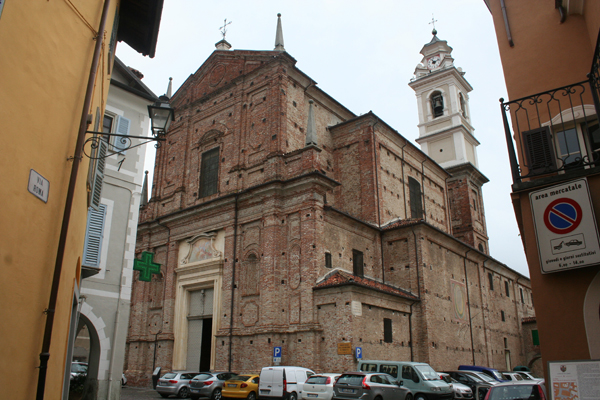 INTERNO Per la sistemazione e decorazione interna della chiesa si succedono numerose maestranze, marmorari, stuccatori, falegnami, pittori, scultori, fabbri e vetrai, che lavorano per apparati e arredi, in un itinerario complesso di interventi, che va oltre il cantiere di Francesco Gallo. I primi significativi lavori d’arredo nel maestoso spazio interno interessano le due grandi cappelle laterali: entrando a destra l’altare delle Anime e a sinistra l’altare della Madonna del Rosario, autografi del Gallo, furono realizzati dal marmoraro genovese Torre (1717-18). I lavori delle due preziose cappelle sono pagati dalle compagnie omonime e con denari che provengono dal Priore Luca Antonio Zavatteri (Rosario) e dalla Dama Camilla Piacenza di Farigliano (Anime). Tra il 1725 e il 1730 è chiamata l’équipe dello stuccatore luganese Cipriano Beltramelli, attivo in Piemonte, che con gusto raffinato inserisce i capitelli corinzi sulle lesene e sulle colonne e modella il cornicione (che corre in alto lungo il perimetro della chiesa) e le cartelle in stucco, che coronano gli arconi laterali.