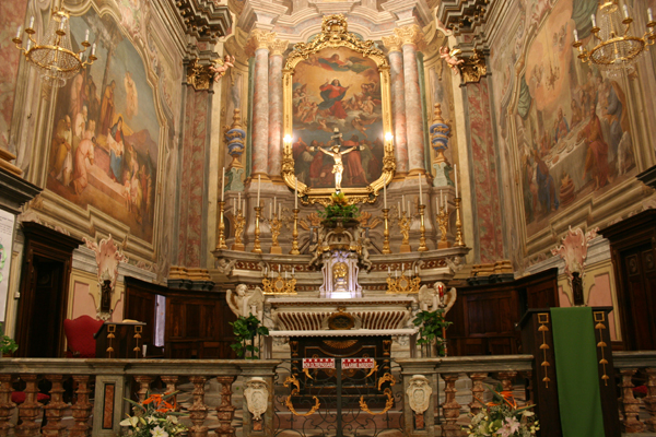 Nel 1729 l’arciprete Carlo Tomaso Badino commissiona l’altare maggiore: una sontuosa mensa barocca festosa di angeli e putti, realizzata dal marmoraro genovese G. A. Ponsanelli, fortemente influenzato dall’opera di G.L. Bernini. L’arciprete committente viene sepolto ai piedi dell’altare prezioso di marmi policromi.